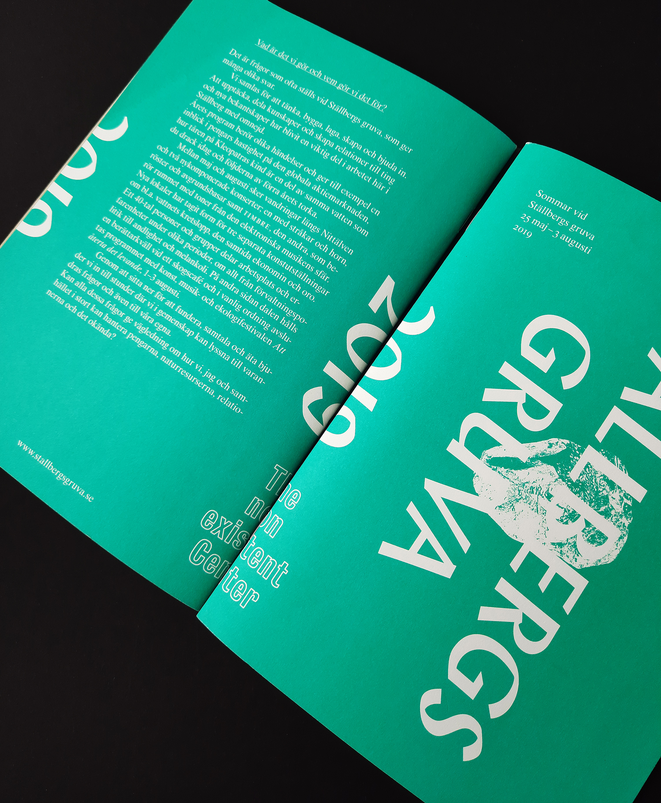 Programme booklet design for Ställbergs Gruva, summer of 2019. Ställbergs Gruva is a center for arts and culture located in an abandoned iron ore mine in Bergslagen, Sweden. The center is run by the business association TNEC, since 2012.