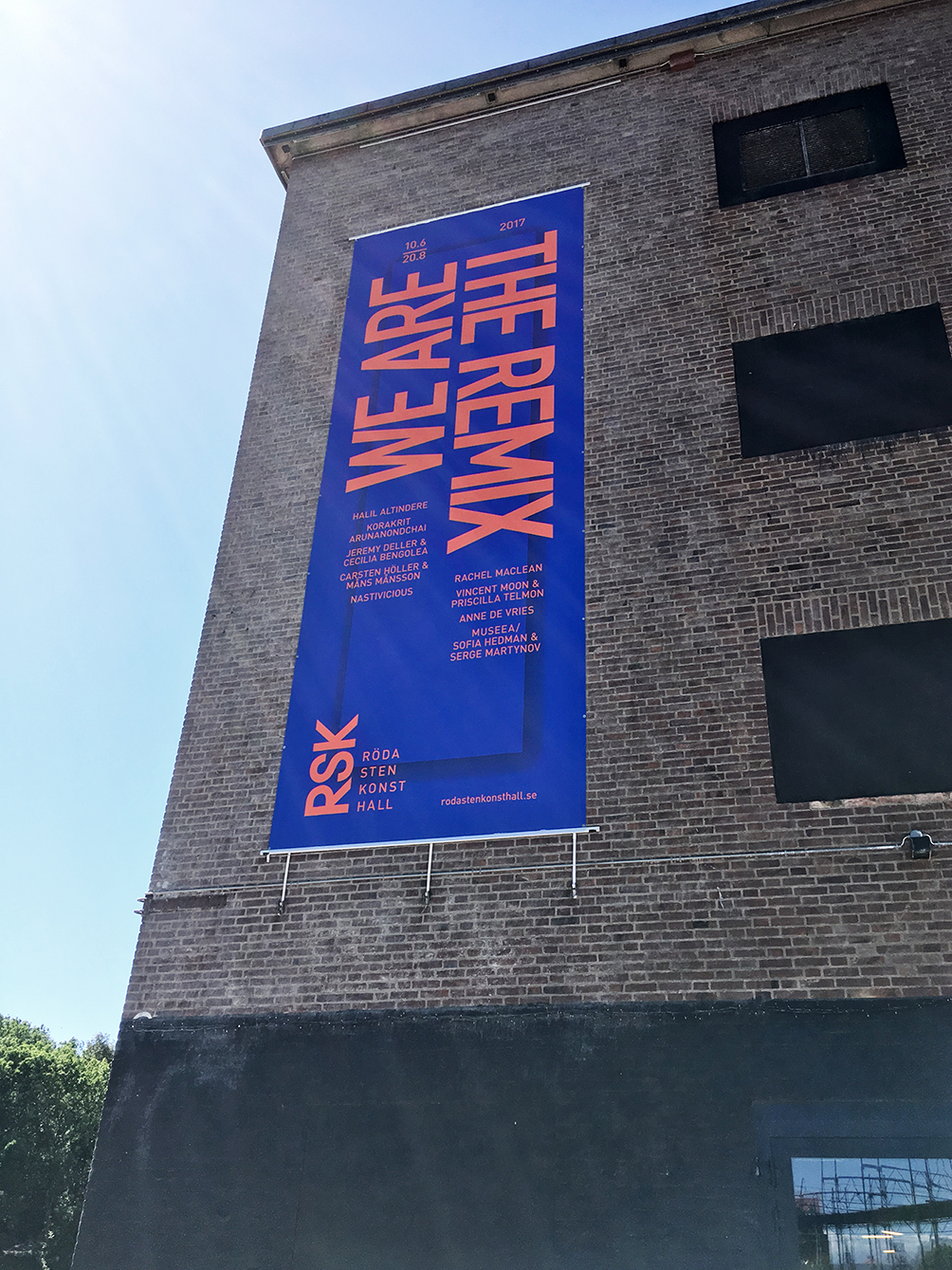 Formgivning av visuell identitet till utställningen WE ARE THE REMIX, producerad av och visad på Röda Sten Konsthall, Göteborg. Affisch, vernissagekort och fasadvepa. Röda Sten Konsthall finns i Göteborg och är en plats för samtidskonst.